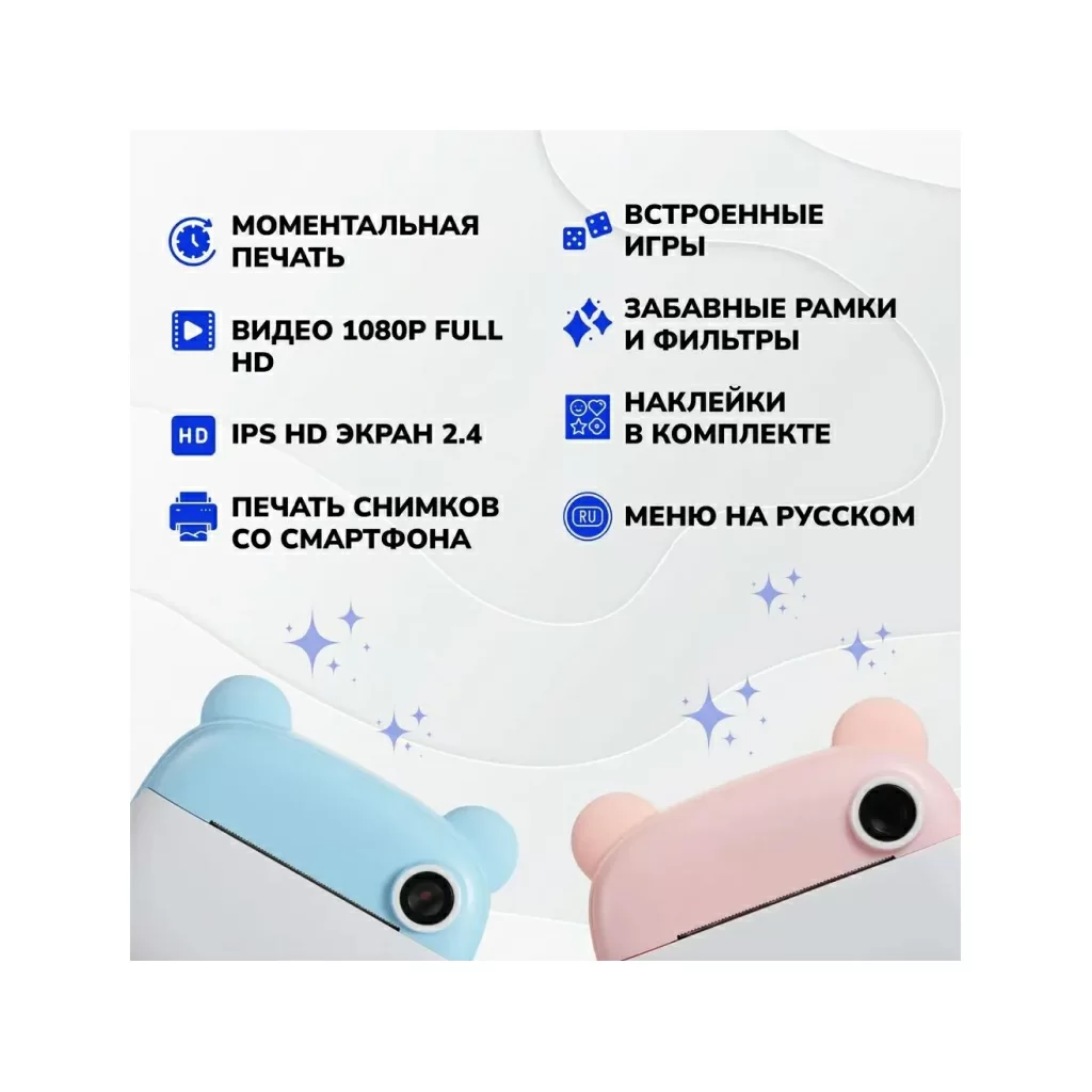 Черно-белая печать дает возможность ребенку окрасить окружающий мир своими красками, а предустановленные игры позволят отдохнуть от творческих экзерсисов. Комплектная карта памяти на 32 ГБ позволит сделать видеоролики и селфи от юного блогера.