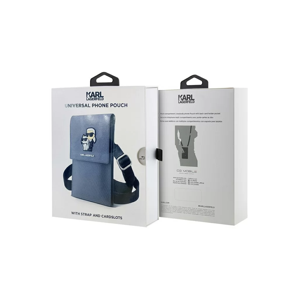Удобная и эффектная сумка-чехол для мобильного телефона, выполненная из прочной искусственной кожи с символикой дома моды Karl Lagerfeld. На откидной крышке сумки размещено фирменное изображение дизайнера или логотипа (в зависимости от модели). Закрывается крышка при помощи магнитной застежки.