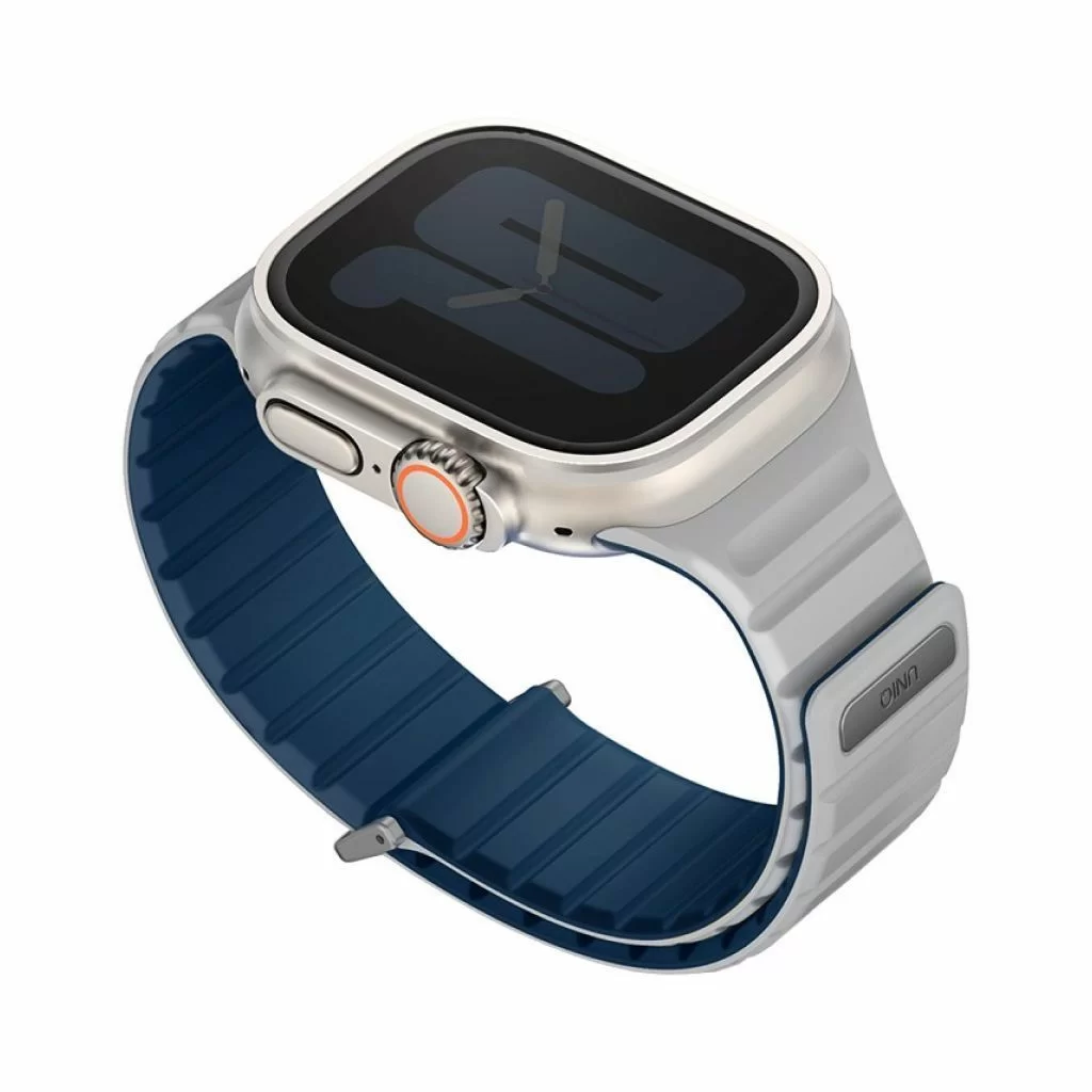 Двусторонний ремешок из мягкого силикона Uniq REVIX EVO для Apple Watch с размером корпуса 49-46-45-44. Вы можете легко поменять внешние стороны ремешка в зависимости от своего стиля и предпочтений. Фиксируется на руке с помощью удобной магнитной застежки, выдерживает нагрузку до 1.2 кг. Возможность регулировки длины за счет встроенных магнитов обеспечивает точное соответствие размерам руки. Металлическая стальная застежка дополнительно фиксирует устройство на запястье, позволяя не беспокоиться об утере даже при занятиях спортом.