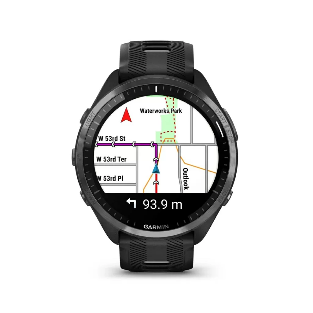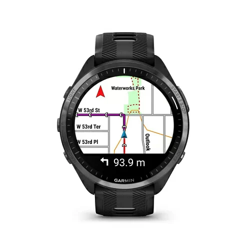 Беговые смарт-часы Forerunner 965 отображают на экране цветные встроенные карты, которые помогут вам не сбиться с маршрута и во время пробежки по городским улицам, и во время велосипедной поездки по лесной трассе.