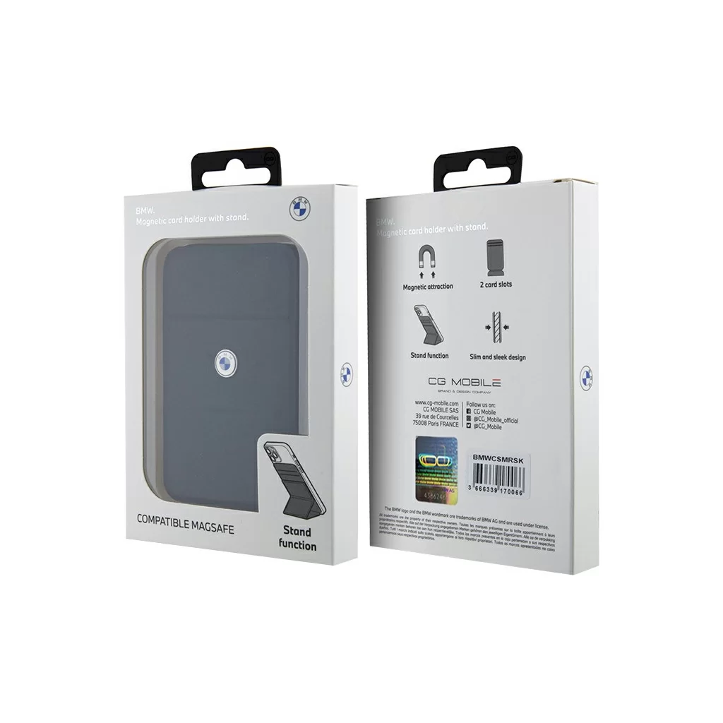 Бумажник BMW Magsafe Wallet поддерживает крепление Apple Magsafe. Инновационное решение позволяет легко и надежно присоединить аксессуар к задней панели вашего смартфона или установить на защитный чехол, который поставляется с магнитным кольцом MagSafe. Картхолдер изготовлен из качественной натуральной кожи, имеет отделение с магнитным клапаном для хранения одной или двух пластиковых карт. Внутренние стороны покрыты микрофиброй. Декорирован металлическим логотипом бренда. Аксессуар также можно использовать в качестве подставки.