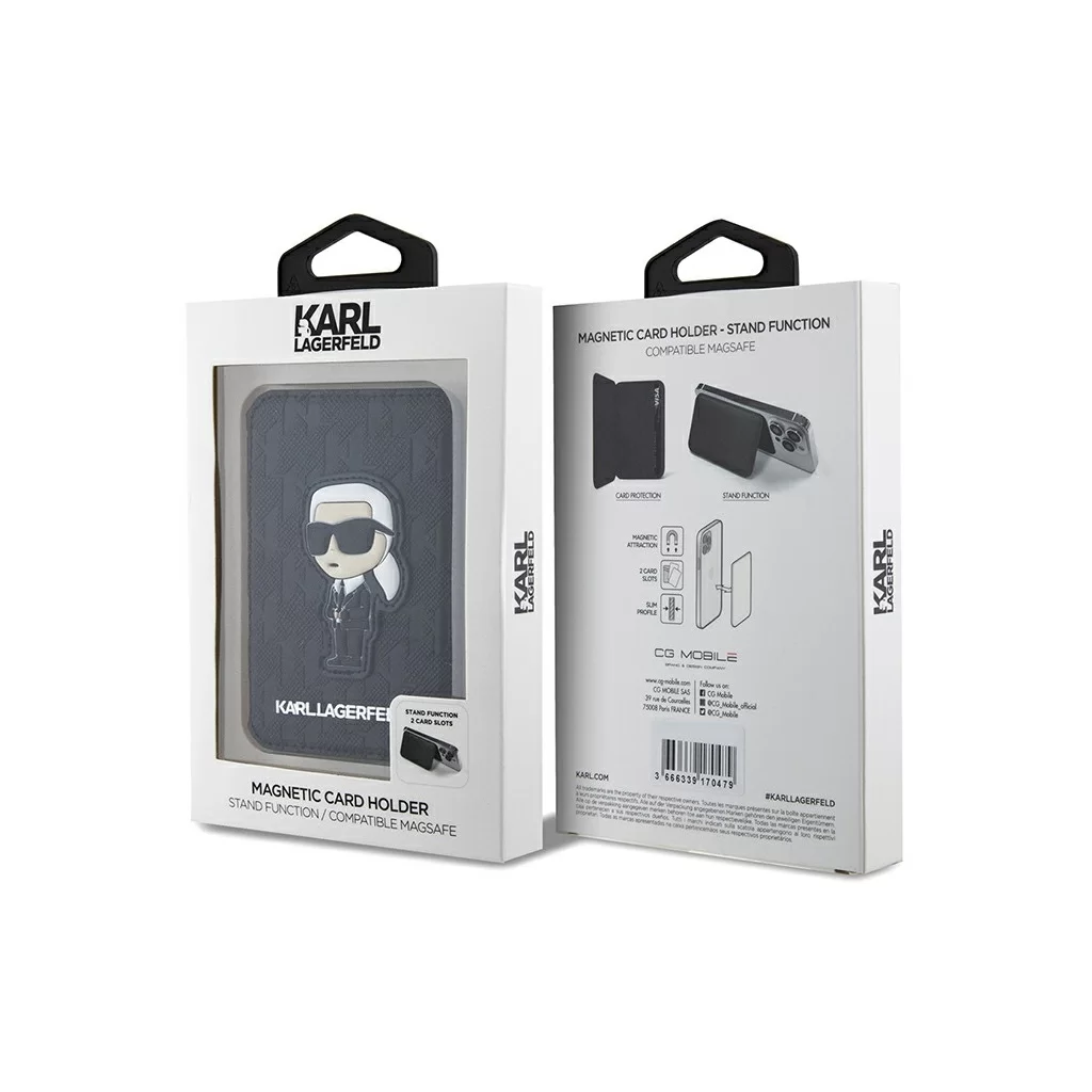 Чехол-бумажник Lagerfeld Wallet MagSafe Cardslot Stand Saffiano Monogram NFT Karl, черный
