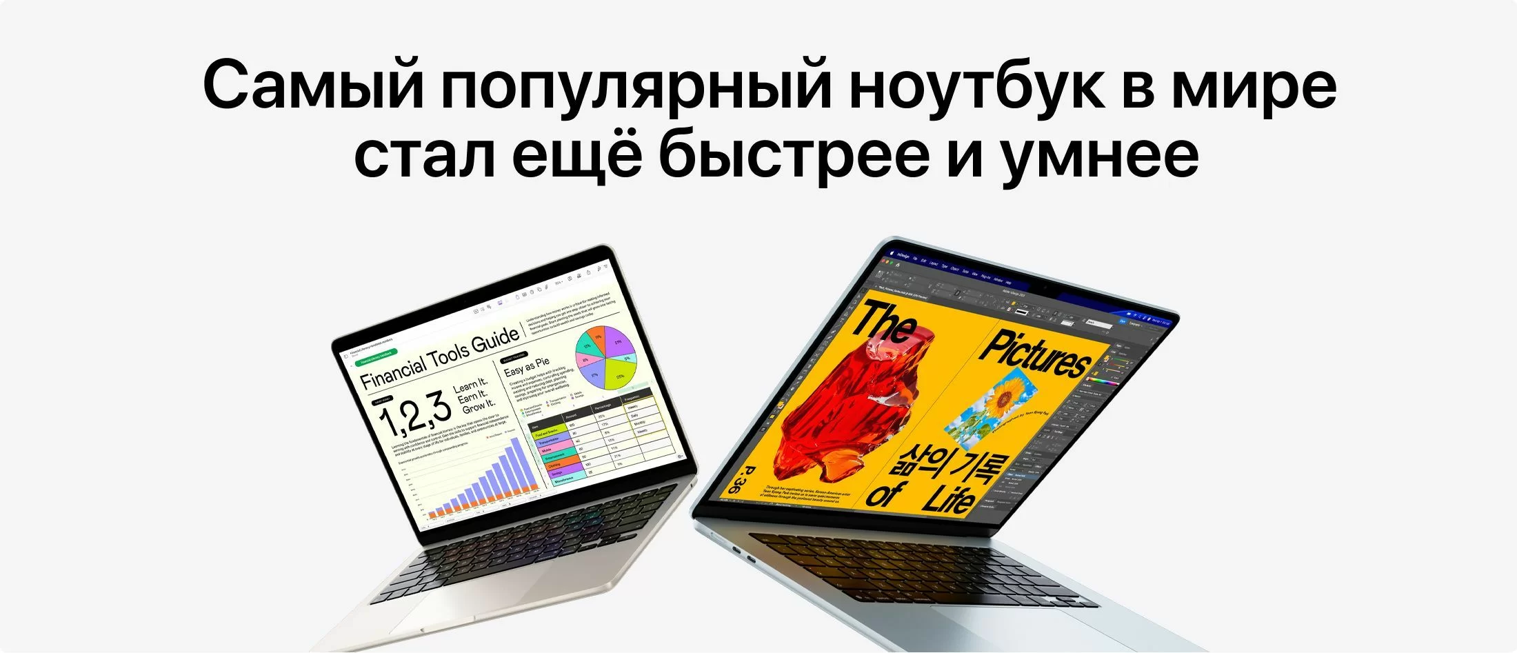 Два размера — 13 и 15 дюймов. Базовая конфигурация теперь включает 512 ГБ хранилища — вдвое больше, чем у M4. SSD нового поколения работает в 2 раза быстрее по скорости чтения и записи, так что даже работа с крупными файлами не требует ожидания. Встроенный чип N1 обеспечивает Wi-Fi 7 и Bluetooth 6 — то же поколение связи, что в MacBook Pro M5.
