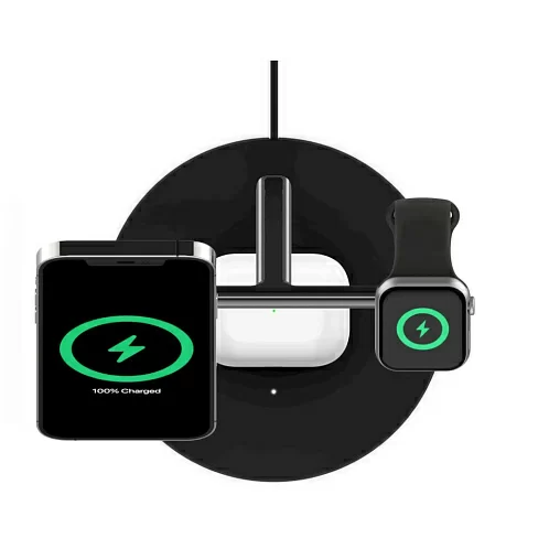 Заряжайте свой iPhone, Apple Watch и AirPods одновременно с помощью нашего беспроводного зарядного устройства MagSafe 3-в-1. Есть подставка для беспроводной зарядки MagSafe мощностью 15 Вт для вашего нового iPhone, модуль магнитной зарядки для Apple Watch и подставка для беспроводной зарядки AirPods.