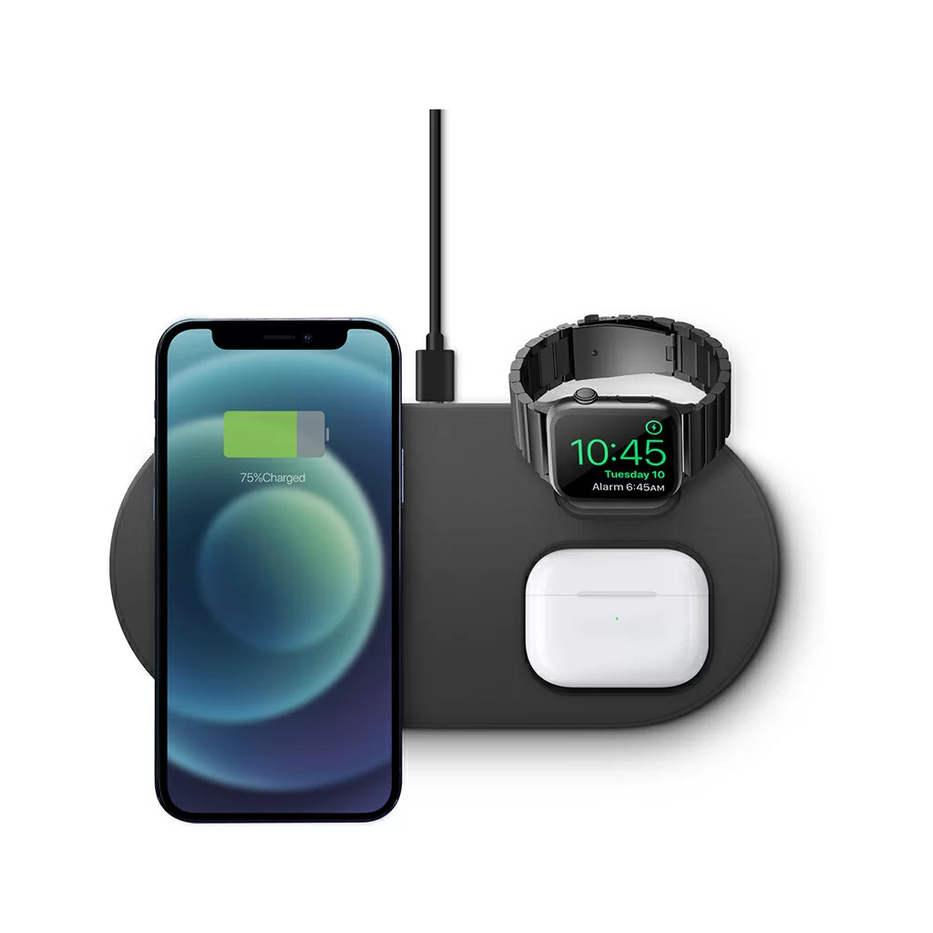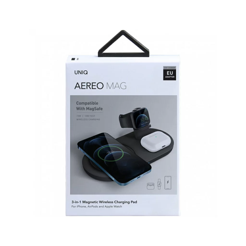 Беспроводная док-станция Uniq Aereo Mag 3-in-1 для одновременной зарядки iPhone, беспроводных наушников AirPods и смарт-часов Apple Watch на одной платформе. Совместимый с MagSafe модуль для быстрой зарядки iPhone. Сетевой блок питания в комплекте. Скорость зарядки с Uniq Aereo Mag на 40% выше по сравнению с другими беспроводными зарядными устройствами. Модуль беспроводной зарядки для часов Apple Watch в комплект не входит.