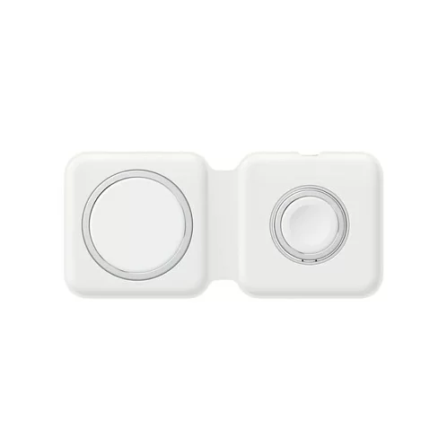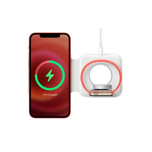 С двойным зарядным устройством MagSafe удобно заряжать совместимые модели iPhone и Apple Watch, беспроводной зарядный футляр для AirPods, а также другие устройства стандарта Qi. Просто положите их на зарядное устройство — и они начнут стабильно и эффективно заряжаться. Кроме того, зарядное устройство компактно складывается, поэтому его удобно брать с собой.