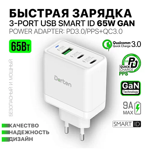 Сетевое зарядное устройство Dorten 3-Port USB Smart ID 65W GaN, PD3.0/PPS+QC3.0, белый