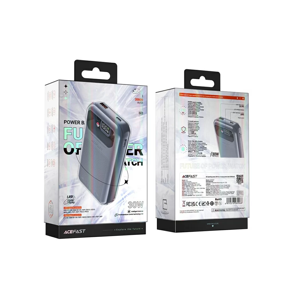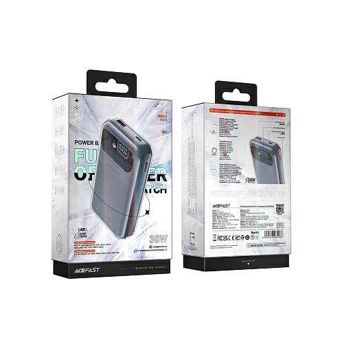 Бренд Acefast основан на волне стремительного развития индустрии электронных и цифровых технологий, что потребовало от компании быстрого реагирования на потребности потребителей. С момента своего создания бренд сосредоточился на разработке высококачественных электронных и цифровых продуктов, включая зарядные устройства, аудиосистемы, кабели, интеллектуальную электронику и средства личной гигиены. Бренд настаивает на идее высокого качества продукции в основе и использует самые передовые технологии в качестве движущей силы для предоставления надежных и эффективных продуктов потребителям во всем мире.ACEFAST Sparkling series 30W fast charging Power Bank — внешний аккумулятор высокой ёмкости с долгим периодом сохранения заряда. В вашем распоряжении 1 стандартный USB порт и 1 USB Type-C порт для зарядки ваших гаджетов. Максимальная мощность составляет 30 Ватт (USB-C). Аккумулятор поддерживает технологии быстрой зарядки, такие как: PD2.0, PD3.0, PPS, QC3.0/QC2.0, QC4+, SCP.