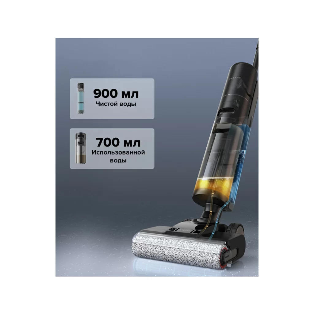 Аккумуляторный блок моющего пылесоса Dreame H13 Pro состоит из 6 элементов по 4900 мАч. Такого запаса энергии в купе с большими резервуарами для воды хватает для очистки как влажных, так и сухих загрязнений в течение 45 минут подряд на площади до 300 м2.