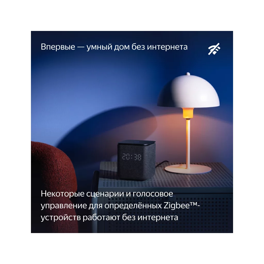 В Яндекс Станцию Миди уже встроен хаб управления Zigbee™, благодаря которому она напрямую взаимодействует с датчиками и другими устройствами умного дома, работающими по протоколу Zigbee™. Сделайте Станцию Миди центром умного дома и общайтесь с ним голосом: например, спрашивайте у Алисы, какие сейчас температура и влажность в комнате. Впервые голосовое управление для некоторых сценариев с определёнными Zigbee™-устройствами может работать даже без интернета.